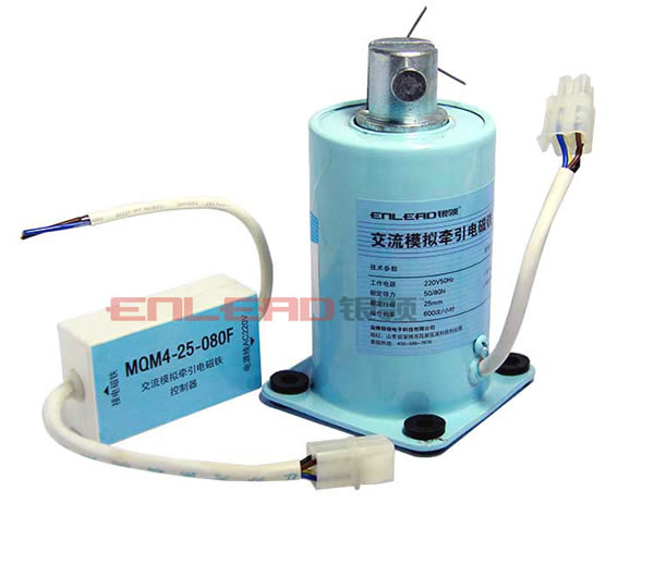 电磁铁控制器装在电磁铁外部,电磁铁的工作过程全部通过控制器来实现。控制器的输入线与用户控制设备相连,输出线通过四芯专用插头与电磁铁相连。